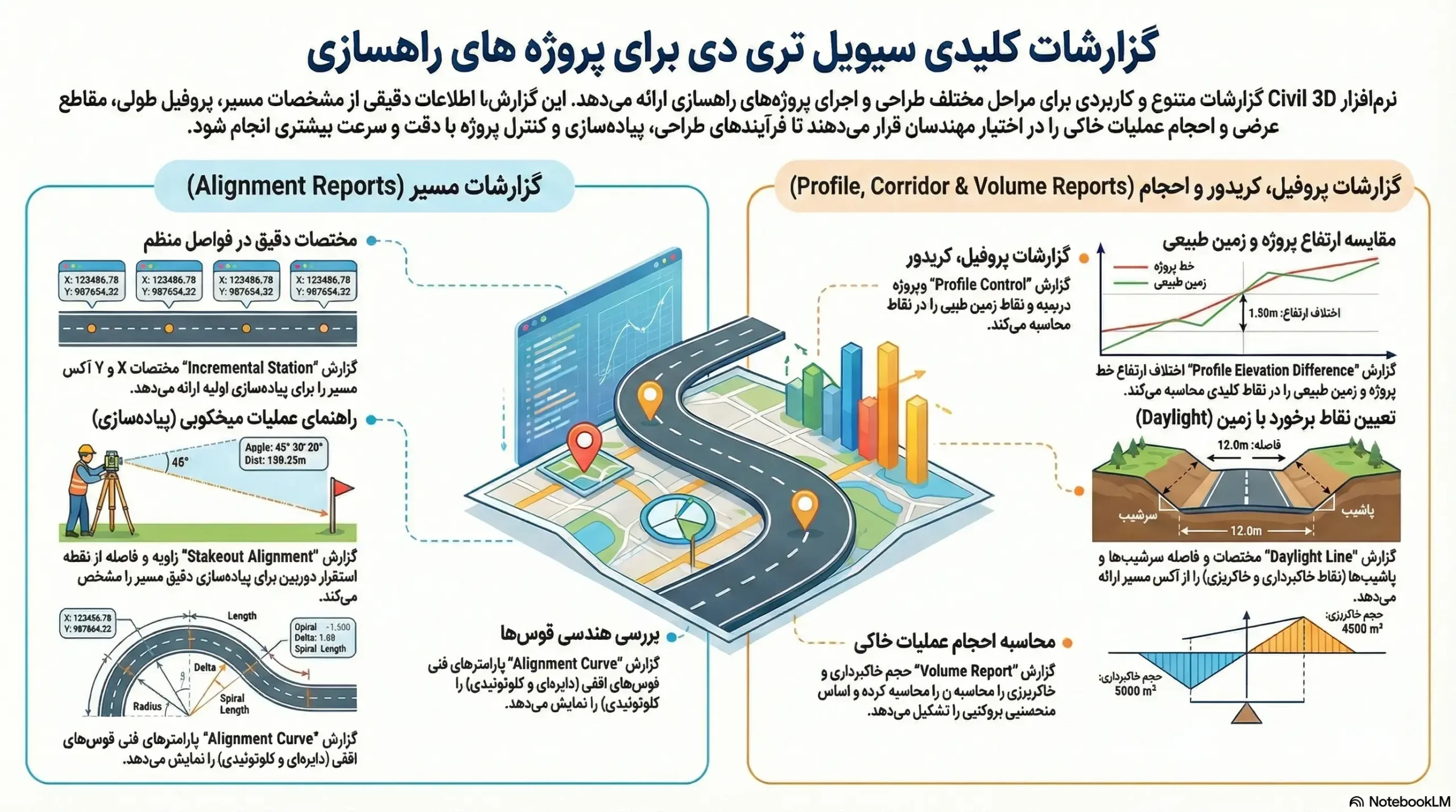 در پروژههای عمرانی، به ویژه پروژههای راهسازی، صحت و دقت اطلاعات در تمامی مراحل، از طراحی تا اجرا، حرف اول را میزند. طراحی مسیر، خط پروژه، مقاطع عرضی و محاسبه احجام، تنها گامهای ابتدایی هستند. آنچه که این طراحیها را به واقعیت تبدیل میکند و امکان پایش و کنترل دقیق عملیات اجرایی را فراهم میآورد، دسترسی به گزارشات جامع و قابل اتکا است. این گزارشات، زبان مشترک بین مهندسان طراح، ناظران و تیم اجرایی در سایت پروژه محسوب میشوند و بدون آنها، پیادهسازی و کنترل کیفی تقریباً غیرممکن خواهد بود.
