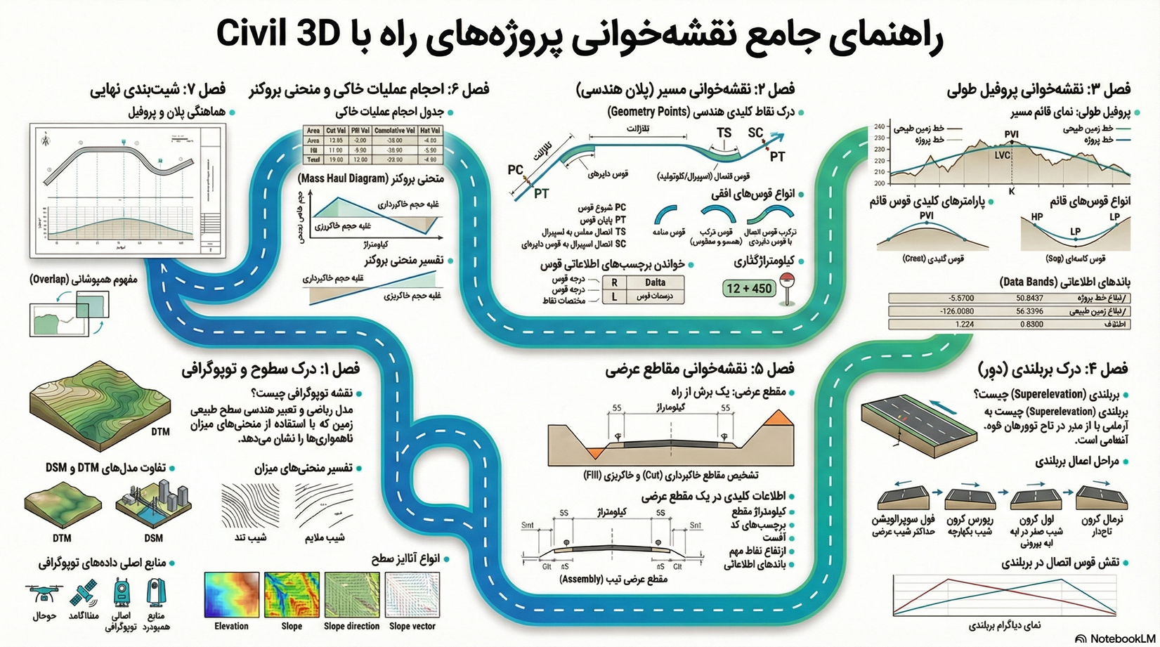 این پکیج آموزشی جامع در هفت فصل مجزا، تمامی جنبههای نقشهخوانی پروژه راه با Civil 3D را پوشش میدهد: